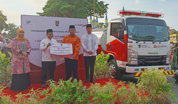 TUBAN – PT Bank Pembangunan Daerah Jawa Timur (Bank Jatim) menyerahkan bantuan satu unit truk tangki air kepada Pemerintah Kabupaten (Pemkab) Tuban, Minggu sore (23/3/2025).