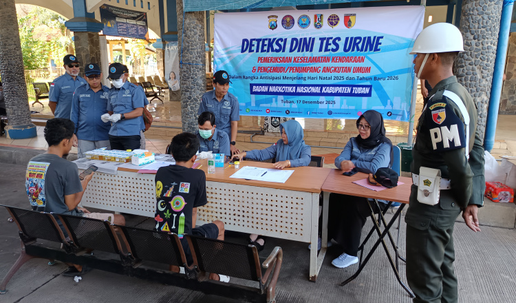 Deteksi dini tes urine berlangsung di Terminal Kambang Putih, Kabupaten Tuban, Rabu pagi (17/12/2025). Pada kesempatan itu, petugas juga memeriksa kelayakan kendaraan dan tes kesehatan sopir serta kernet.
