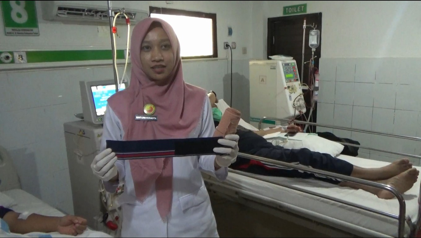 Tuban – Sejumlah perawatn Rumah Sakit Umum Dokter Koesma Tuban, membuat inovasi tali pelindung bekas tusukan paska cuci darah. Tali elastis kekinian itu dibuat lebih pendek, dan efektif mengurangi kebocoran darah pada bagian lengan.