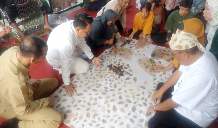 PJ Gubernur Jatim, Adhy Karyono, ikut nimbrung mencoba membuat kerajinan eco print bersama penghuni RSBG Tuban.