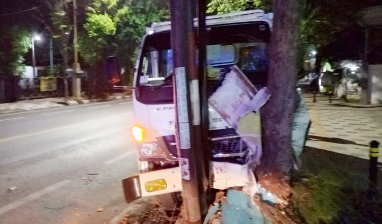 Dalam perjalanan, kendaraan tiba-tiba oleng ke kiri hingga akhirnya menabrak pohon di pinggir jalan. Kerasnya benturan, menyebabkan, bagian depan truk mengalami kerusakan cukup parah.