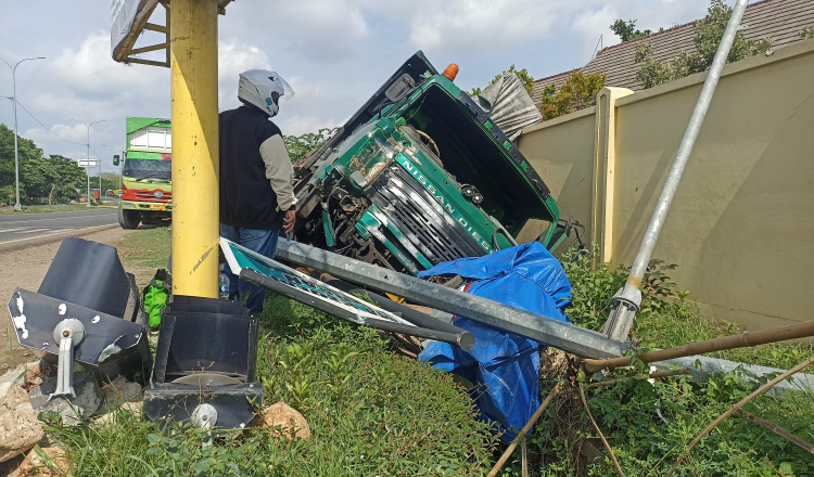 Kondisi truk trailer terguling di parit usai tabrak traficlight dan gerobak.