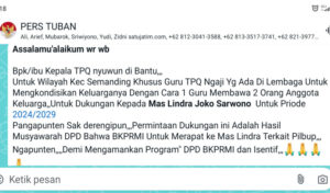 Tuban – Viral, sebuah pesan Whatsapp menginstruksikan guru-guru Taman Pendidikan Qur’an (TPQ) di wilayah Kecamatan Semanding, Kabupaten Tuban, untuk memenangkan ...